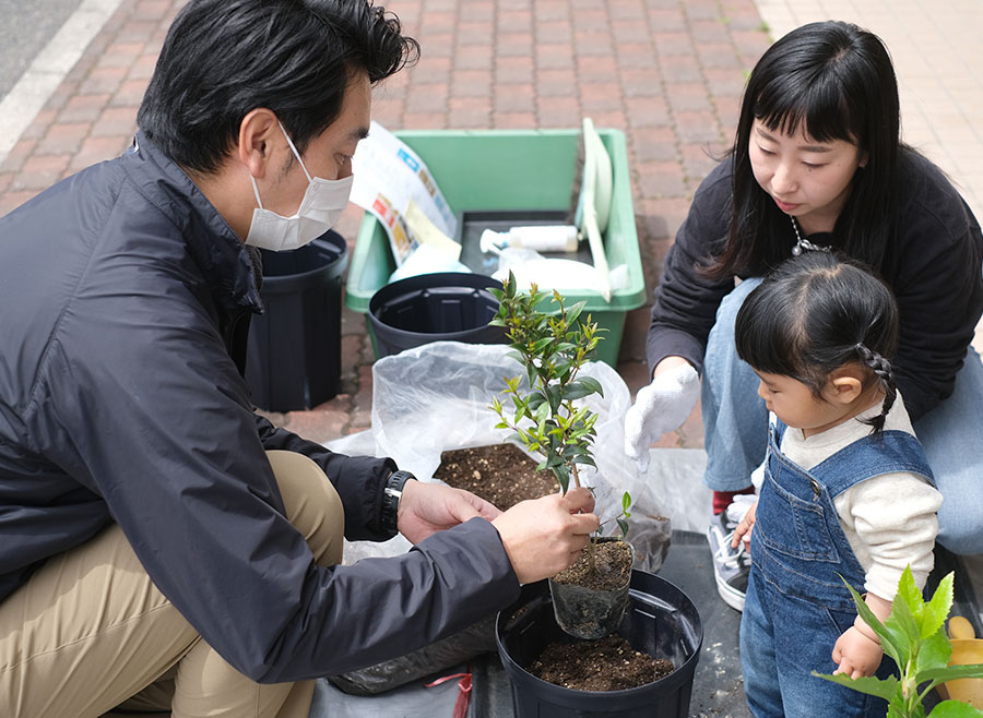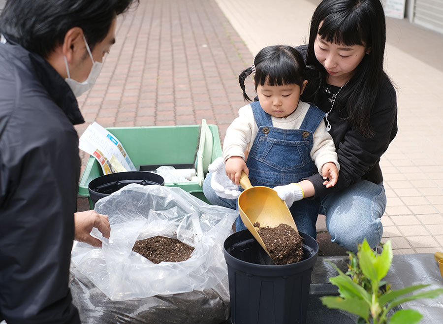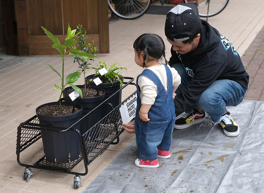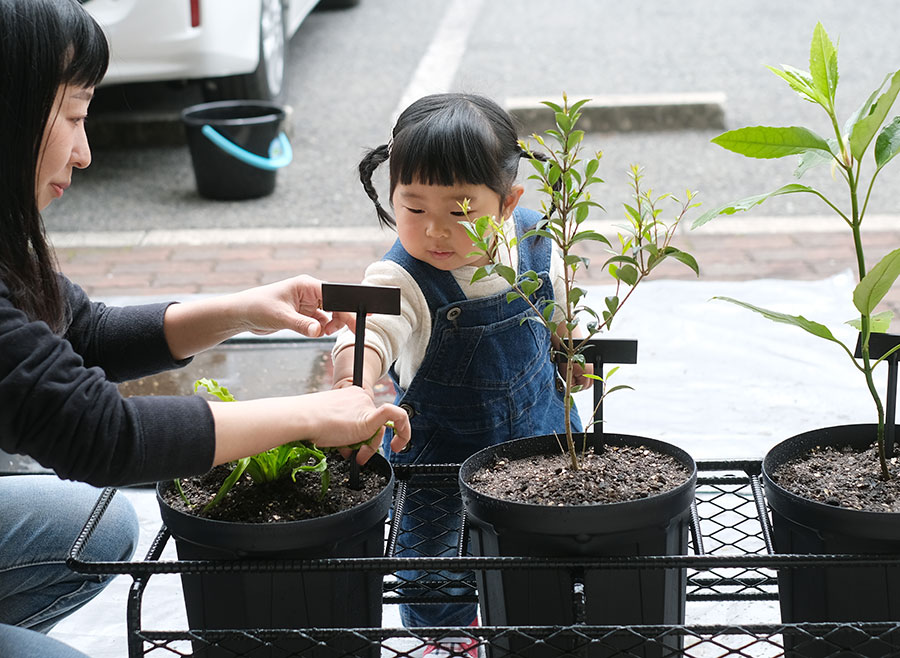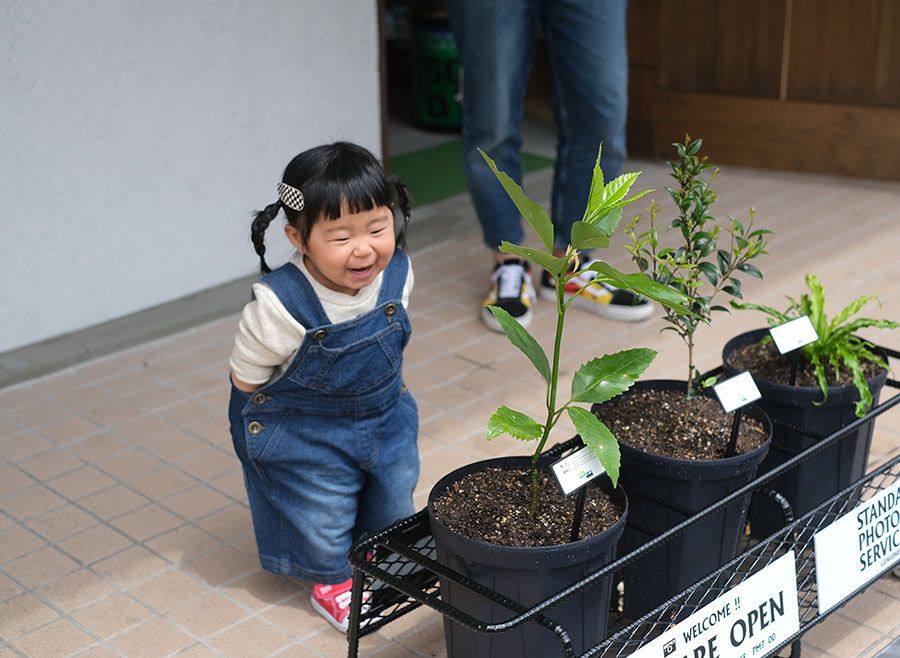 (お子様)笑顔でお父さん、お母さんの植栽を見ていました。
